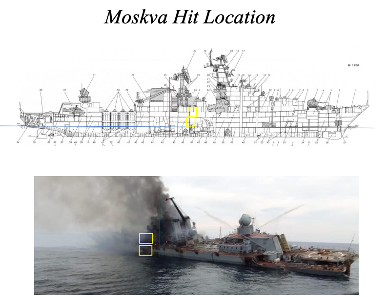 报道称,爆炸起火的核心位置(卡尔森认为就是乌克兰导弹命中位置)位于这艘军舰最脆弱的地方——吃水线上方的动力舱室。动力舱室遭到攻击,很可能会对提供动力的燃气轮机和蒸汽轮机造成重大损害,并可能使主轴扭曲,从而对减速齿轮造成损坏。”“动力系统的严重损毁可能导致船上的所有电力损失,并可能使自动损坏控制设备失效。”