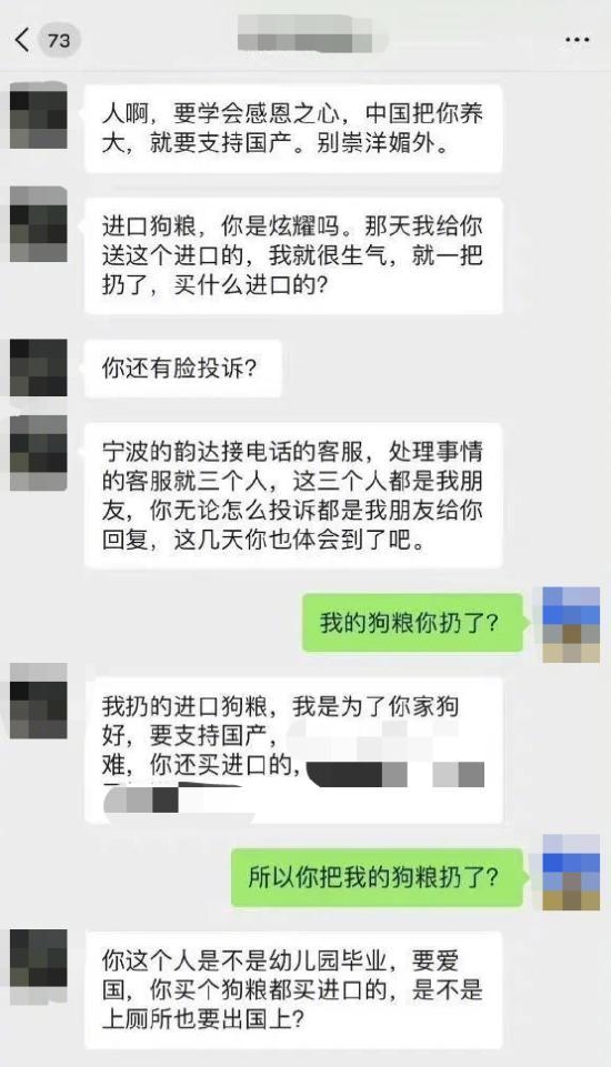 近日,网传浙江宁波一韵达快递员扔了客户的进口狗粮,理由是 “ 买进口狗粮不爱国 ”,此事引发网友关注。网传聊天截图显示,该快递员在聊天中有不少侮辱性语言,还称“举报也没有用”。