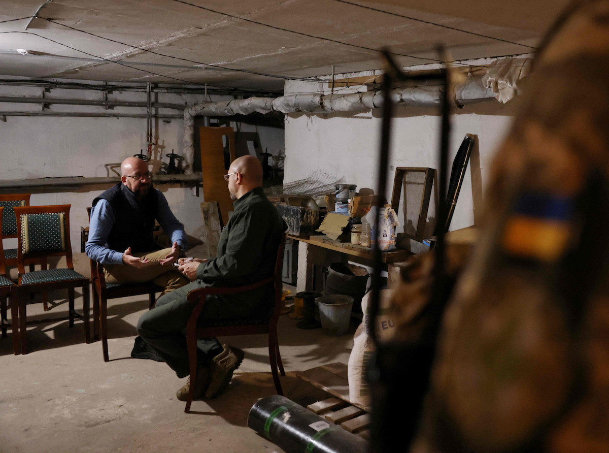 当地时间2022年5月9日,乌克兰敖德萨,欧洲理事会主席米歇尔(左)访问了乌克兰黑海港口城市敖德萨,在防空洞内会见了乌克兰总理什米加尔(右)。