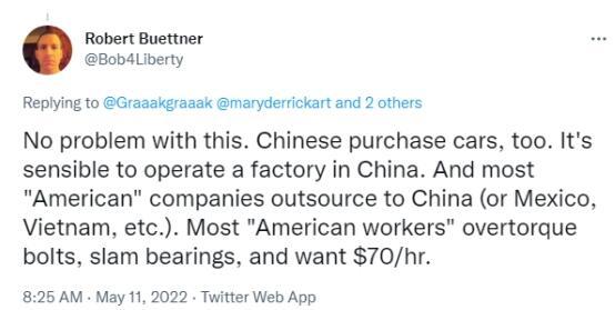 有人也做了番对比称,马斯克说的“没毛病。中国人也购买汽车。在中国开工厂是明智的。大多数‘美国’公司将业务外包给中国(或墨西哥、越南等)。大多数‘美国工人’过度拧紧螺栓、猛击轴承,并要求 70 美元/小时(的工资)。”↓