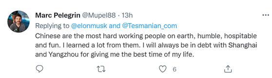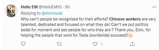 “为什么人们的努力不能得到认可? 中国工人非常有才华,专注于他们所做的事情! 我们就不能暂时把政治放在一边,看清人们的本性吗? 谢谢你,埃隆,你让为特斯拉(全球)工作的人成功!”