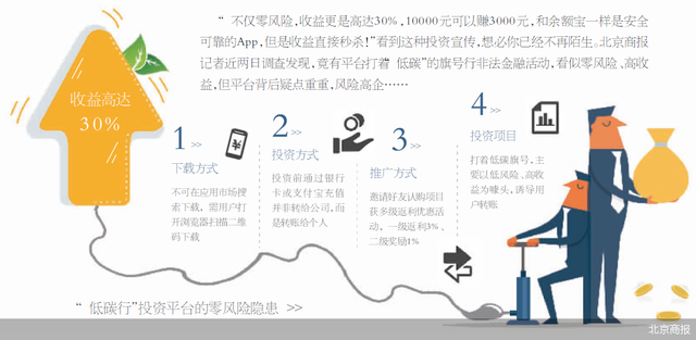 “不仅零风险,收益更是高达30%,10000元可以赚3000元,和余额宝一样是安全可靠的App,但是收益直接秒杀!”看到这种投资宣传,想必你已经不再陌生。北京商报记者近两日调查发现,竟有平台打着“低碳”的旗号行非法金融活动,看似零风险、高收益,但平台背后疑点重重,风险高企……
