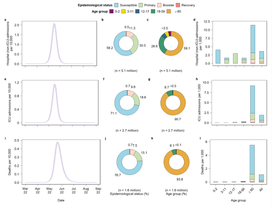 余宏杰团队模拟的基线结果显示,在全国尺度上,如不采取大规模严格非药物干预措施(NPIs,non-pharmaceutical interventions),2022年5-7月会出现非常陡峭的流行高峰。在6个月的模拟期间,奥密克戎流行预计导致508万人次住院,267万人次入住ICU和155万人死亡。而未接种疫苗的60岁及以上老年人将占死亡人数的74.7%,即超115万死亡的患者为老年人。