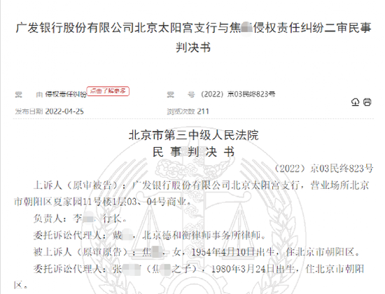 在一审胜诉后,广发银行太阳宫支行向北京市三中院提起上诉,但其上诉请求均被驳回,维持原判。
