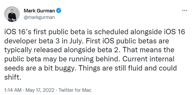 Gurman 在一条推文中说,今年的 iOS 16 测试版发布时间表有些不同。据该记者称,苹果计划在 7 月推出 iOS 16 的第一个公共测试版和第三个开发者测试版。而在往年,新的 iOS 版本的第一个公共测试版会与第二个开发者测试版一起推出。
