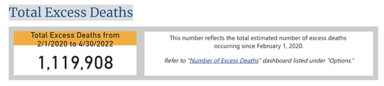 CDC数据还显示,从2020年2月1日至2022年4月30日,美国总的超额死亡人数超过119万人。