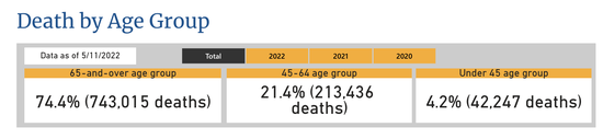从死亡病例的年龄分布来看,美国死亡的COVID-19感染者中,74.4%的是65岁及以上的老年人。不过,45-64岁年龄段的人群死亡人数也超过21万,占21.4%。此外,小于45岁的青年和儿童死亡人数也超过4万,占4.2%。