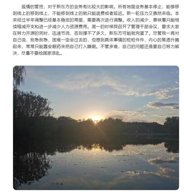 中国经济周刊-经济网讯 5月17日,新东方创始人俞敏洪在其个人公众号“老俞闲话”发文《老俞闲话丨在无奈和坚强中前行! 》。俞敏洪称,疫情的管控,对于新东方的业务有比较大的影响。所有地面业务基本停止,能够移到线上的移到线上,不能移到线上的就只能退费或者延迟。新一轮压力又骤然来临。本来经过半年调整已经基本稳定的局面,需要再次进行调整。收入的减少,意味着只能继续缩减开支和进一步减少人力资源费用。周一的时候我召开了管理干部会议,要求大家在努力开源的同时,迅速节流,否则撑不了多久,新东方可能就完蛋了。尽管我一再对自己说,别急别急,困难一定会过去的,但想到具体事情的桩桩件件,内心的焦虑升腾起来,常常只能靠安眠药来把自己打入睡眠。不管多难,自己的问题还是要自己努力解决,尽量不要给国家添乱。