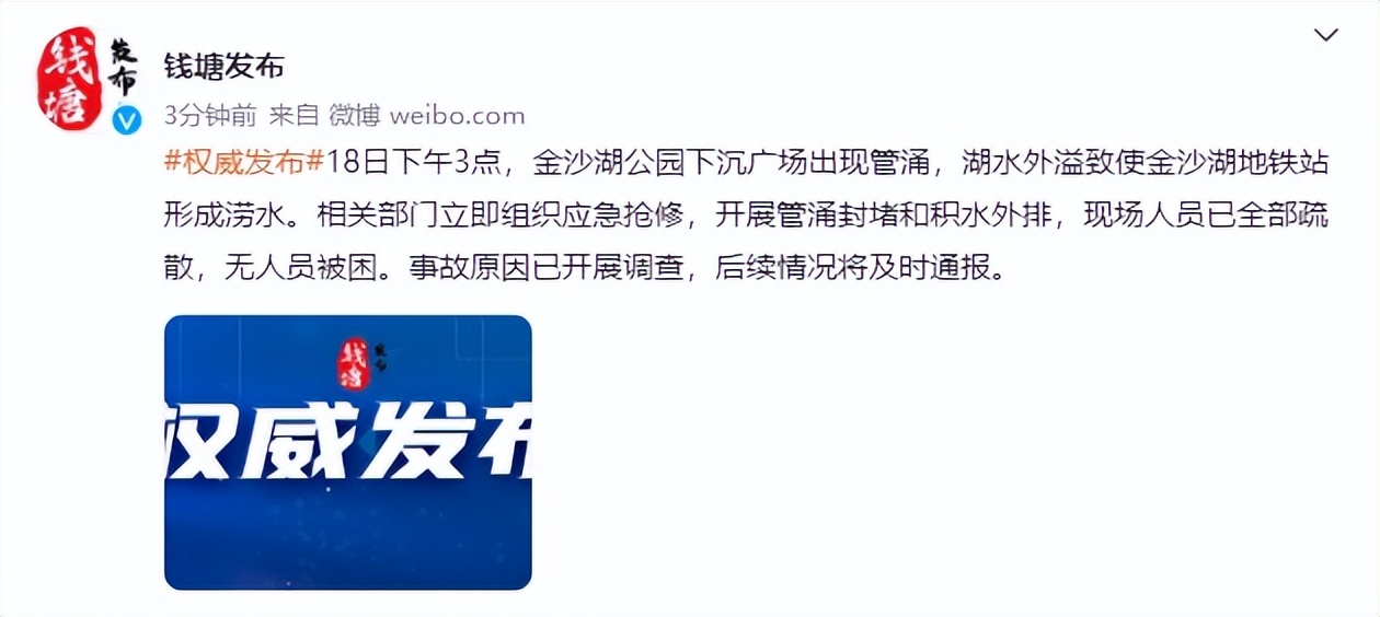 18日下午3点,金沙湖公园下沉广场出现管涌,湖水外溢致使金沙湖地铁站形成涝水。相关部门立即组织应急抢修,开展管涌封堵和积水外排,现场人员已全部疏散,无人员被困。事故原因已开展调查,后续情况将及时通报。
