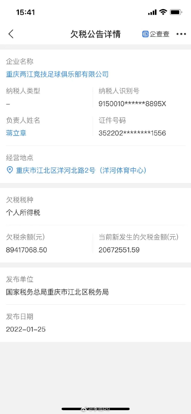 李璇在微博中表示:“当代准备给重庆相关部门的手写稿。 2021年4月30日前俱乐部未付 551,696,575.87 元。2021年5月-2022年3月俱乐部未付 202,130,702.03 元。 我去深入了解了一下,2021年4月30日前俱乐部未付 551,696,575.87 元中,包括欠薪、欠税和各种运营费用。简单查了一下,截至2021年1月,俱乐部欠税八千多万,算上这几个月,欠税过亿。”