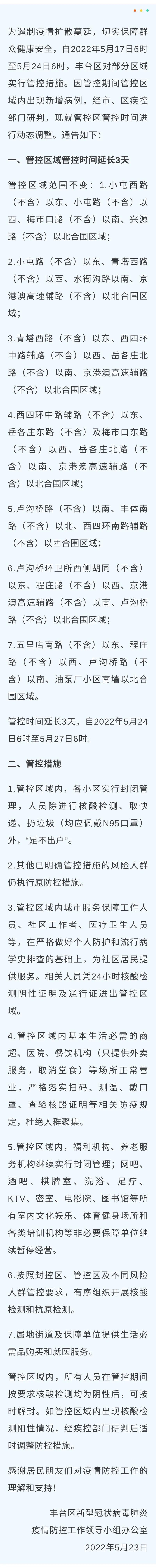据北京丰台客户端消息,丰台区对管控区管控时间进行动态调整,具体内容如下: