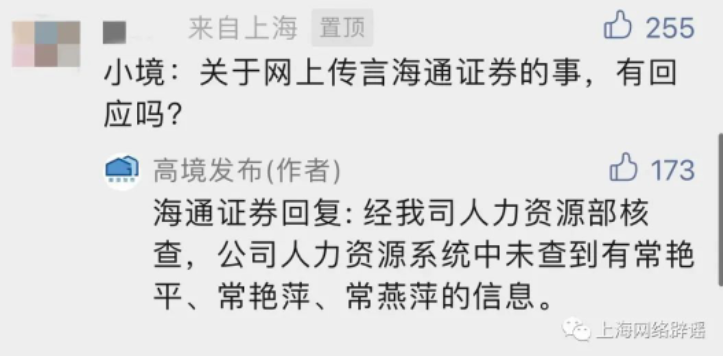 高境镇今天也在微信公号“高境发布”回应网民问题时称,“海通证券回复:经我司人力资源部核查,公司人力资源系统中未查到有常艳平、常艳萍、常燕萍的信息”。