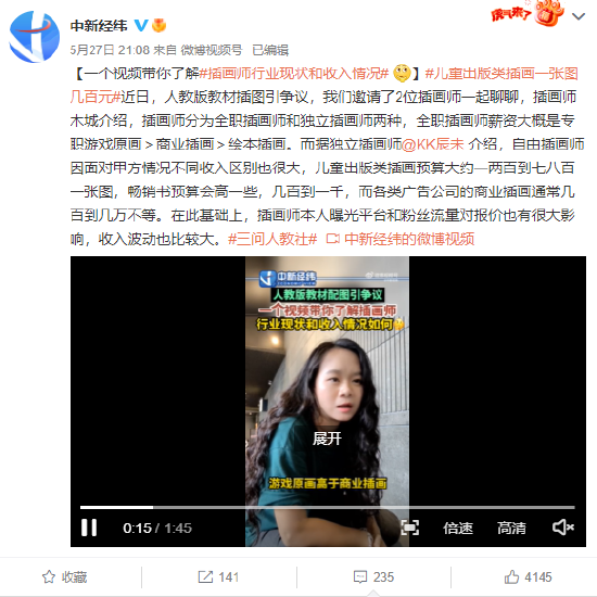 【一个视频带你了解#插画师行业现状和收入情况# [思考]】#儿童出版类插画一张图几百元#近日,人教版教材插图引争议,我们邀请了2位插画师一起聊聊,插画师木城介绍,插画师分为全职插画师和独立插画师两种,全职插画师薪资大概是专职游戏原画>商业插画>绘本插画。而据独立插画师@KK辰未 介绍,自由插画师因面对甲方情况不同收入区别也很大,儿童出版类插画预算大约一两百到七八百一张图,畅销书预算会高一些,几百到一千,而各类广告公司的商业插画通常几百到几万不等。在此基础上,插画师本人曝光平台和粉丝流量对报价也有很大影响,收入波动也比较大。#三问人教社#