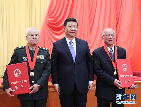 2019年1月8日,习近平在国家科学技术奖励大会上向获得2018年度国家最高科学技术奖的哈尔滨工业大学刘永坦院士和中国人民解放军陆军工程大学钱七虎院士颁奖。