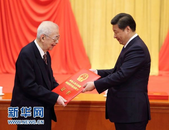 2015年1月9日,习近平在国家科学技术奖励大会上向获得2014年度国家最高科学技术奖的中国科学院院士、中国工程物理研究院高级科学顾问于敏颁奖。