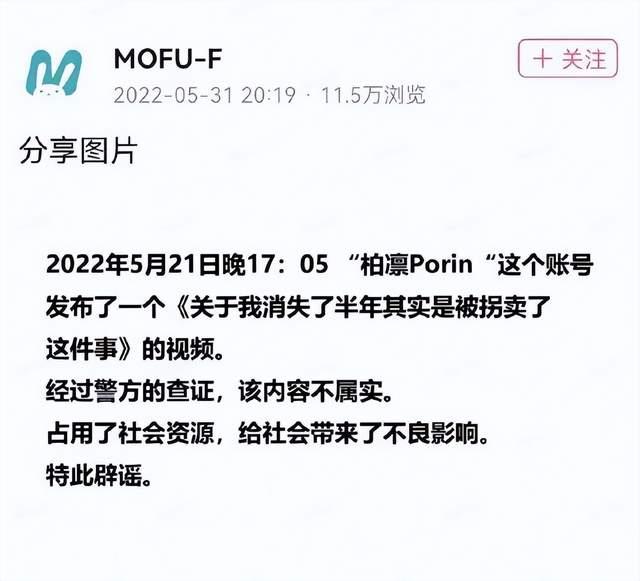 5月31日,柏凛Porin所属社团官方账号MOFU-F发布动态辟谣:经警方查证,之前《关于我消失了半年其实是被拐卖了这件事》视频内容不属实。占用了社会资源,给社会带来了不良影响。特此辟谣。