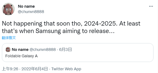 推特爆料者 @chunvn8888称,GalaxyA系列折叠屏手机的计划似乎还处于早期阶段,并向外媒Neowin透露,三星移动部门负责人RohTae-moon不知道何时开展该项目,最起码也是在2024年或以后了。