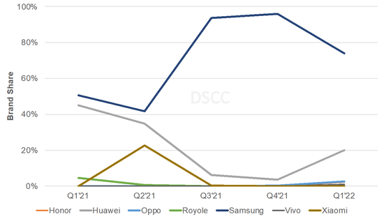 IT之家此前报道,据咨询机构DSCC数据显示,2022年第一季度,可折叠智能手机出货量同比增长571%,达到222万部。三星继续主导该品类,份额为74%。