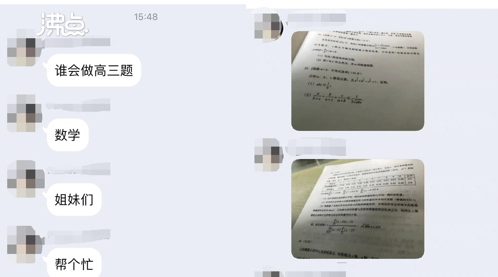 2022年全国高考数学考试于6月7日15:00-17:00举行。该场考试结束不久,网上开始流传一些截图,截图显示,有人于15:48分在某群里询问谁会做高三数学题,表示“我可以出钱”,并贴出了多张内容为数学试题的图片。相关图片被网友晒到微博上,并询问是否为今年高考数学试题。澎湃新闻注意到,在多条相关微博下,都有很多自称为今年高考生的网友回复称,截图中的试题与2022年高考数学全国卷试题(乙卷)理科卷相关试题一致。