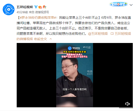 6月9日,罗永浩在直播间吐槽,苹果现在产品做成那个样子,我要去做他们的产品负责人,肯定这公司产品能造福无数人,上去三个台阶不止。他还表示,不是我非要自己做老板,问题是苹果不来啊,所以我只能想办法收购他们。(@五环短视频)