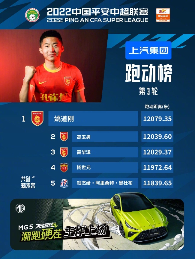 6月14日,中超官方发布了第三轮跑动榜,其中,本轮跑动榜前三名均是河北队球员,其中姚道刚12079.35米排名榜首。