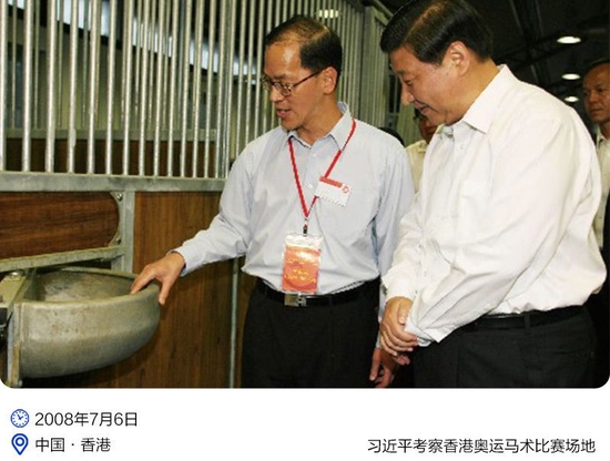 距离北京奥运会开幕还有30多天,时任国家副主席的习近平来到香港,实地考察北京奥运会、残奥会马术比赛筹办情况,他赞扬香港仅用3年左右时间就建成了两个高水平、现代化的奥运马术赛场,“广大香港同胞一定会在祖国体育事业发展史上创造新的辉煌”。