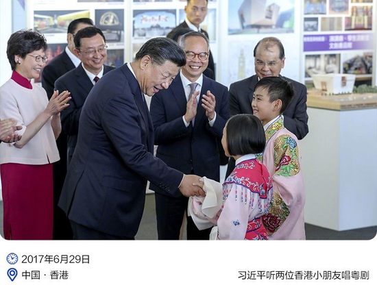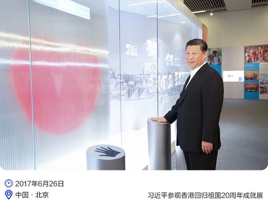 2017年6月26日,习近平主席在国家博物馆参观香港回归祖国20周年成就展,在展厅按下了“同心圆”互动装置触摸板,一颗澎湃的红心闪现在面前的电子大屏幕上。