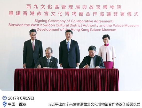 2017年6月29日,习近平主席抵达香港当天,便风尘仆仆前往西九文化区考察,见证西九文化区管理局和故宫博物院签署《兴建香港故宫文化博物馆合作协议》。