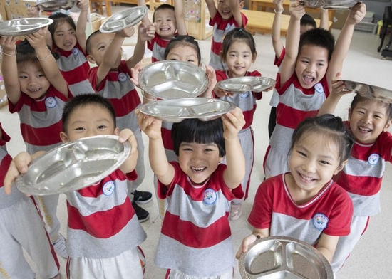 ↑浙江省诸暨市滨江幼儿园小朋友在午餐时比赛谁吃得最干净(2021年10月14日摄)。