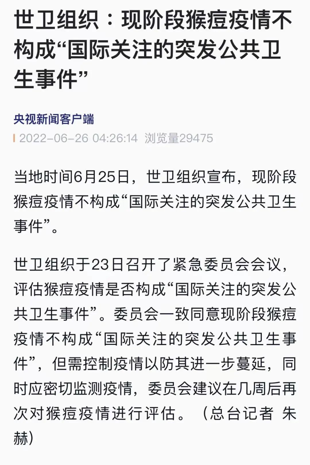 世卫组织于23日召开了紧急委员会会议,评估猴痘疫情是否构成“国际关注的突发公共卫生事件”。委员会一致同意现阶段猴痘疫情不构成“国际关注的突发公共卫生事件”,但需控制疫情以防其进一步蔓延,同时应密切监测疫情,委员会建议在几周后再次对猴痘疫情进行评估。