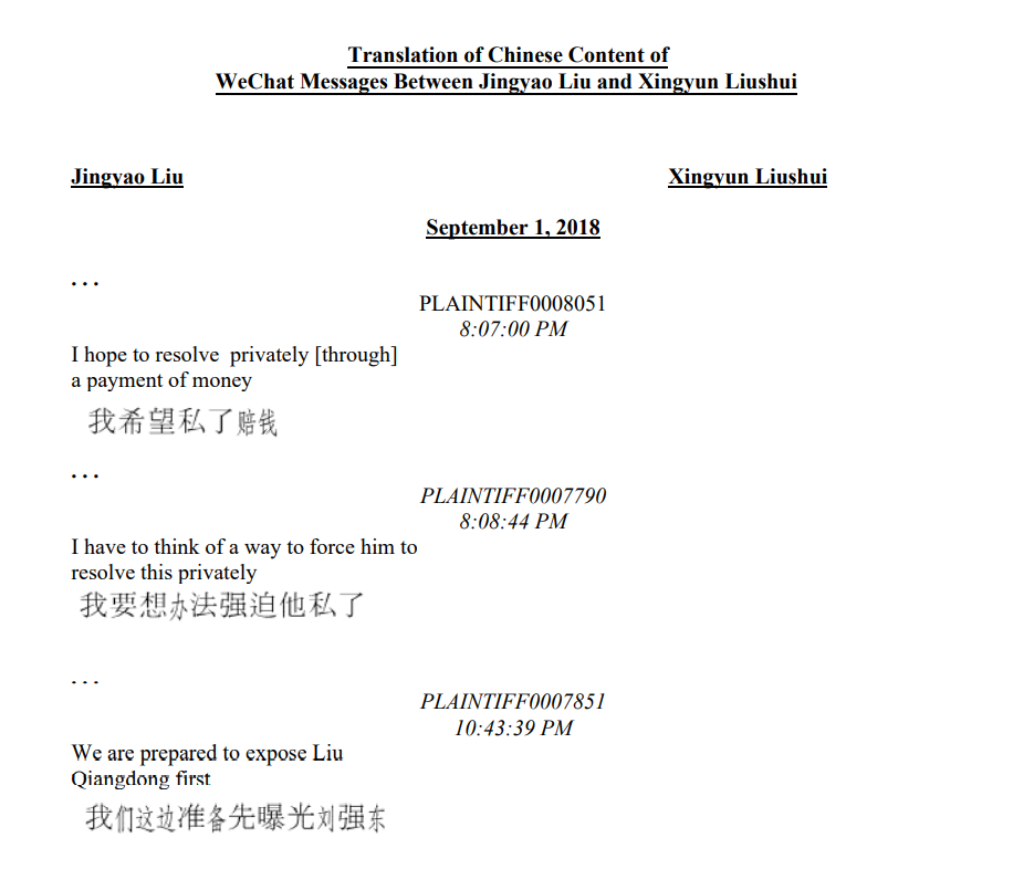 文件将事件与京东关联在一起,“在京东晚宴结束后,以为自己像京东员工Alice Zhang承诺的那样被带回家的jingyao,在未经允许的情况下被带到一个未知的地方,并遭受了京东CEO不受欢迎的身体接触”。