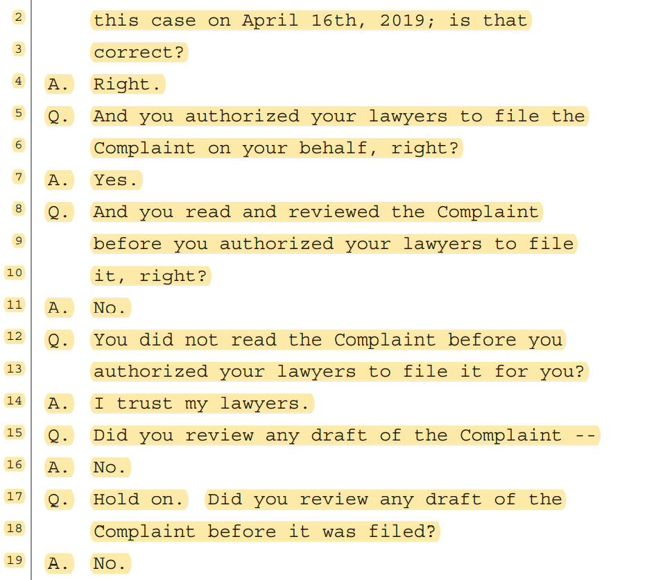 意见书还称,Liu Jingyao证词中确认,“在授权她的律师提交起诉前,没有阅读或审查(起诉书)”,而只是让她的律师自己起草。同时,Liu Jingyao在提交起诉后才看过这份起诉书,并“谎称起诉中的所有指控都是真实的”。