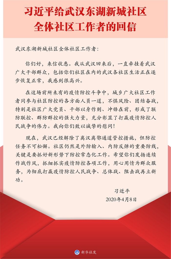 2020年,武汉市东湖新城社区的全体社区工作者给习近平总书记写信,表达了对习近平总书记和党中央的感激之情,以及继续坚守好阵地、履行好职责的坚强决心。