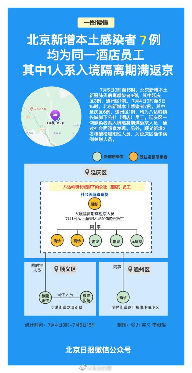 7月6日,据北京日报:7月4日至5日15时,北京累计报告7例新冠肺炎病毒感染者,涉及2个区,其中延庆区6例、通州区1例,均为延庆区八达岭镇长城脚下的公社(酒店)员工,其中1人系入境隔离期满返京人员。疫情溢入是北京当前面临的最大风险。