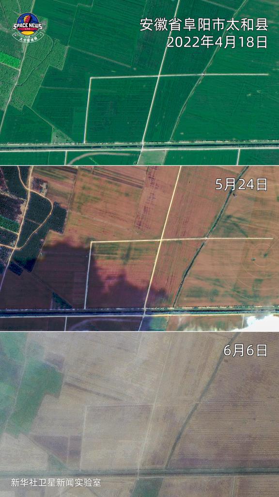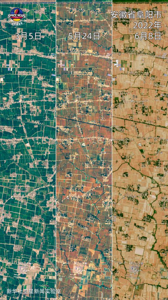 从卫星俯瞰安徽省阜阳市,2022年由春转夏,麦田从春耕春管时的一片碧绿,逐渐转为待收割时的一片深黄,再到已收割后的浅黄。
