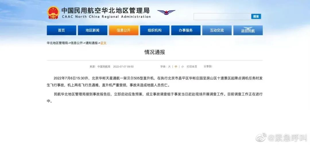 据中国民用航空华北地区管理局官网消息,2022年7月6日15:30许,北京华彬天星通航一架贝尔505型直升机,在执行北京市昌平区华彬庄园至房山区十渡景区起降点调机任务时发生飞行事故,机上两名飞行员遇难,直升机严重受损,事故未造成地面人员伤亡。