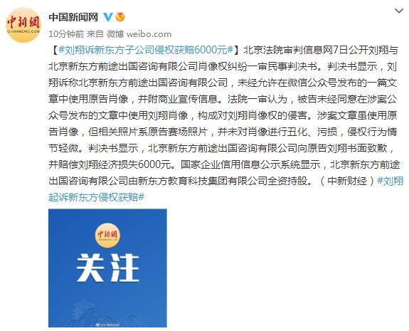 北京法院审判信息网7日公开刘翔与北京新东方前途出国咨询有限公司肖像权纠纷一审民事判决书。判决书显示,刘翔诉称北京新东方前途出国咨询有限公司,未经允许在微信公众号发布的一篇文章中使用原告肖像,并附商业宣传信息。法院一审认为,被告未经同意在涉案公众号发布的文章中使用刘翔肖像,构成对刘翔肖像权的侵害。涉案文章虽使用原告肖像,但相关照片系原告赛场照片,并未对肖像进行丑化、污损,侵权行为情节轻微。判决书显示,北京新东方前途出国咨询有限公司向原告刘翔书面致歉,并赔偿刘翔经济损失6000元。国家企业信用信息公示系统显示,北京新东方前途出国咨询有限公司由新东方教育科技集团有限公司全资持股。(中新财经)