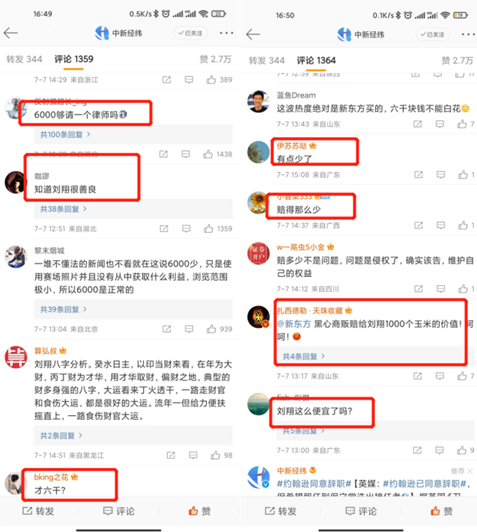 消息曝出并迅速登上微博热搜后,网友们纷纷表示,“才六千啊?6000够请一个律师吗?”,“赔得这么少,刘翔这么便宜了?”