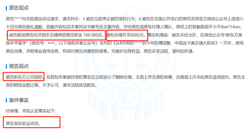 文书显示,知名运动员刘翔诉称,被告新东方未经允许在公众号“新东方美国中学留学”发布的文章中使用其肖像,并附商业宣传信息,构成对其肖像权的侵害。要求被告在全国公开发行的报纸及其官方微信公众号上,连续六十日向原告赔礼道歉,同时赔偿原告经济损失及精神损害抚慰金150000元、维权合理开支5000元。