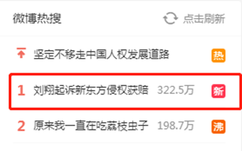 消息曝出后,#刘翔起诉新东方侵权获赔#的话题迅速引发热议,并快速登上微博热搜榜第一。
