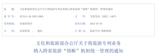 7月7日,文化和旅游部发布关于将旅游专列业务纳入跨省旅游“熔断”机制统一管理的通知称,即日起恢复旅游专列,纳入跨省旅游“熔断”机制管理。