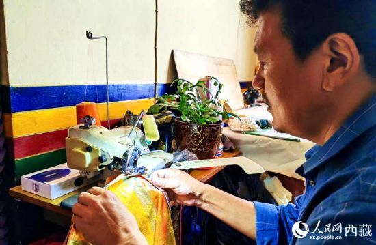 米玛格列正在缝制藏装。人民网 李海霞摄