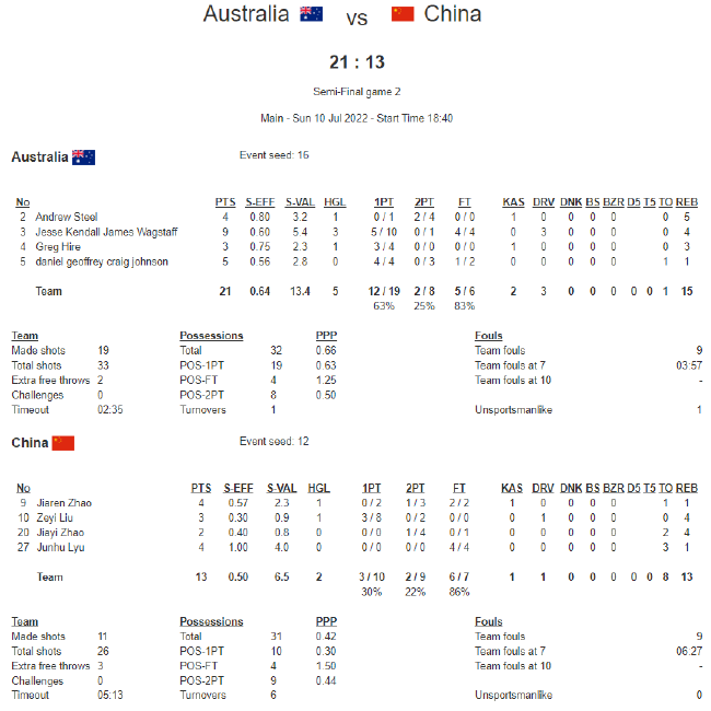赵嘉仁进攻3秒违例,斯蒂尔弧顶远投打板命中,希尔中路强行突破上篮得手,中国队进攻12秒违例,约翰逊转身后仰抛投打爆比分。最终,中国三人男篮13-21不敌澳大利亚队,无缘决赛。