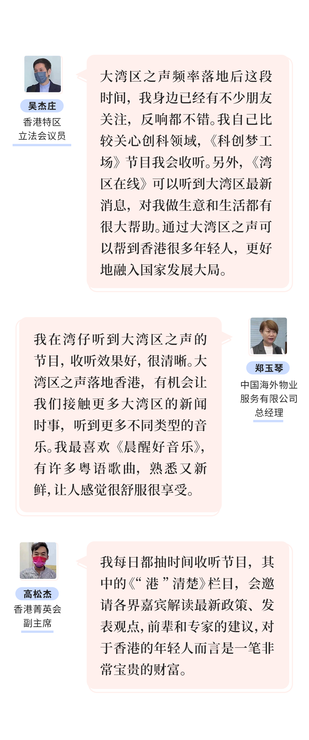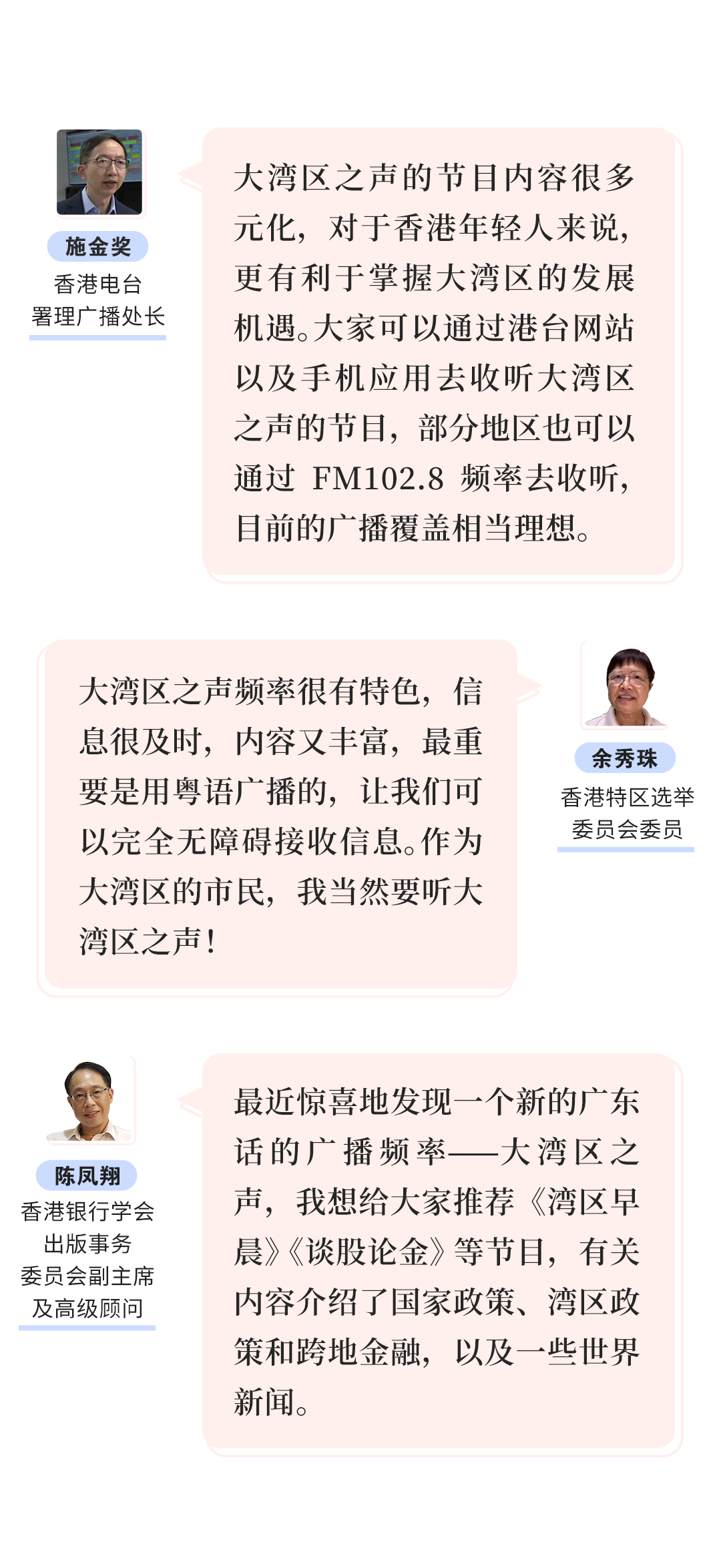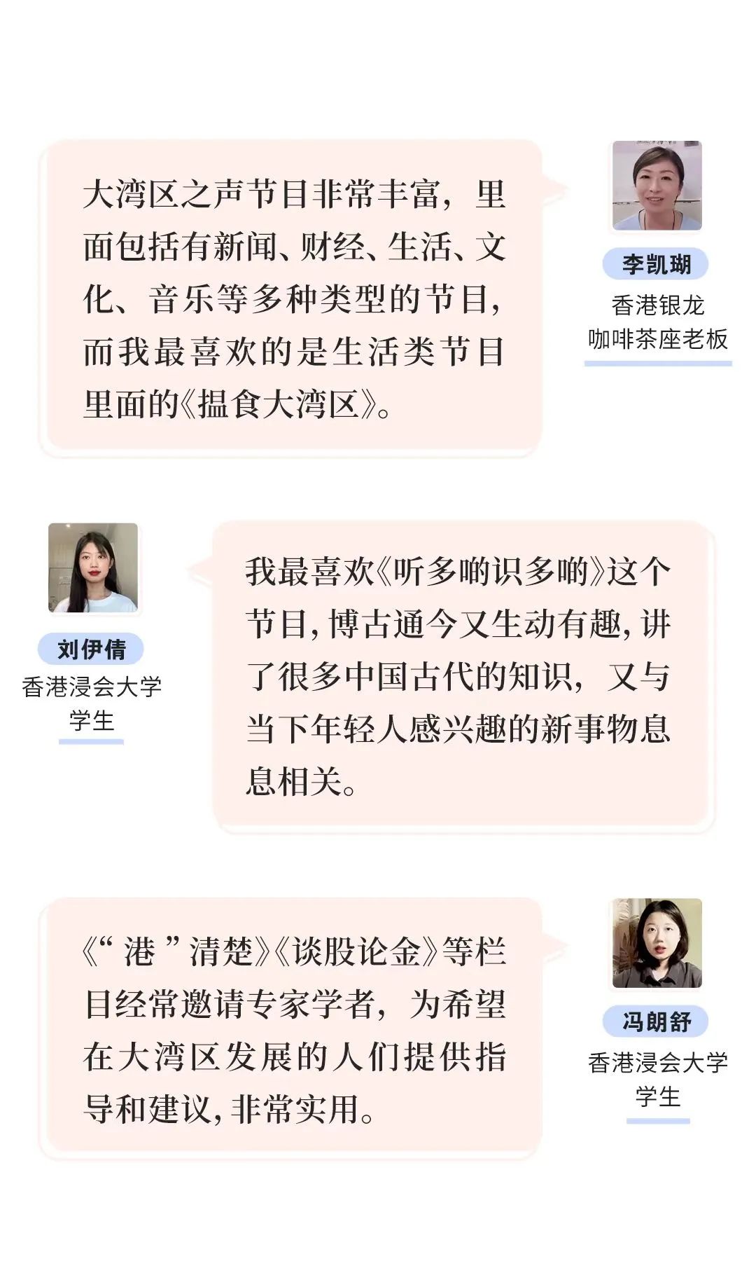 粤港澳大湾区之声突出港澳元素和湾区元素,更加贴近港澳受众收听习惯。《湾区,早晨!》《“港”清楚》等新闻节目及时传播中央权威声音,播发涉港澳、涉湾区新闻资讯;音视频融合节目《听多啲识多啲》《谈股论金》等,加强国情知识教育、提供财经资讯服务,带来体验式、沉浸式感受;《华夏原创金曲榜》《叹世界》《揾食大湾区》等节目,播出粤语流行金曲、提供生活旅游资讯服务,满足香港青年群体需求......更多精彩,敬请关注!(大湾区之声)