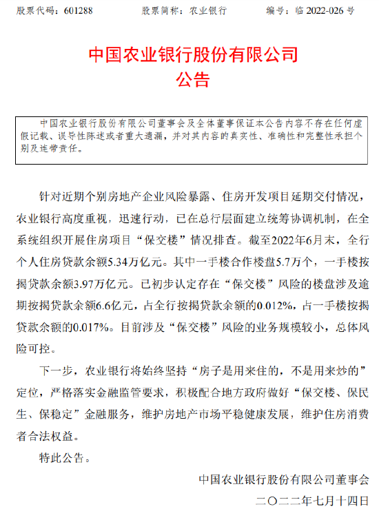 同时,该公告显示,截至2022年6月末,农业银行全行个人住房贷款余额5.34万亿元。其中一手楼合作楼盘5.7万个,一手楼按揭贷款余额3.97万亿元。已初步认定存在“保交楼”风险的楼盘涉及逾期按揭贷款余额6.6亿元,占全行按揭贷款余额的0.012%,占一手楼按揭贷款余额的0.017%。目前涉及“保交楼”风险的业务规模较小,总体风险可控。下一步,农业银行将始终坚持“房子是用来住的,不是用来炒的” 定位,严格落实金融监管要求,积极配合地方政府做好“保交楼、保民生、保稳定”金融服务,维护房地产市场平稳健康发展,维护住房消费者合法权益。