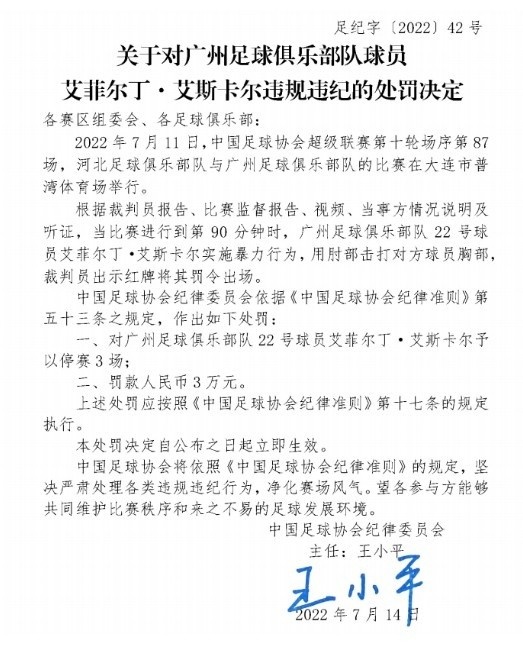 7月14日,足协官方宣布,广州队球员艾菲尔丁因暴力行为禁赛3场,罚款3万元。