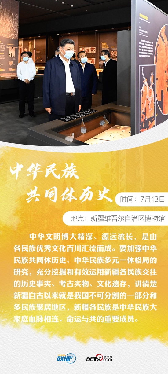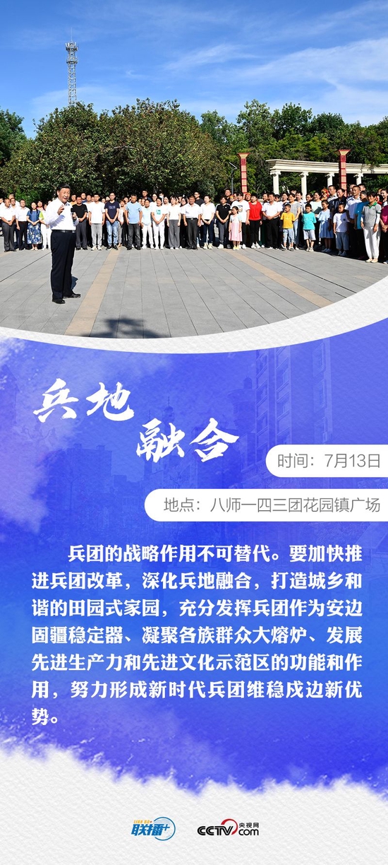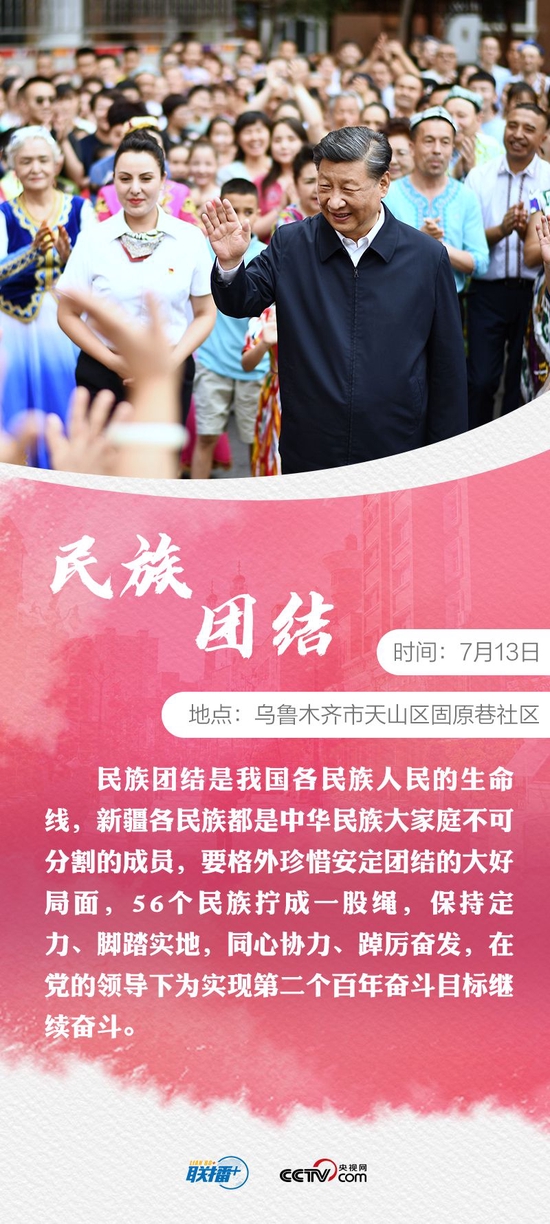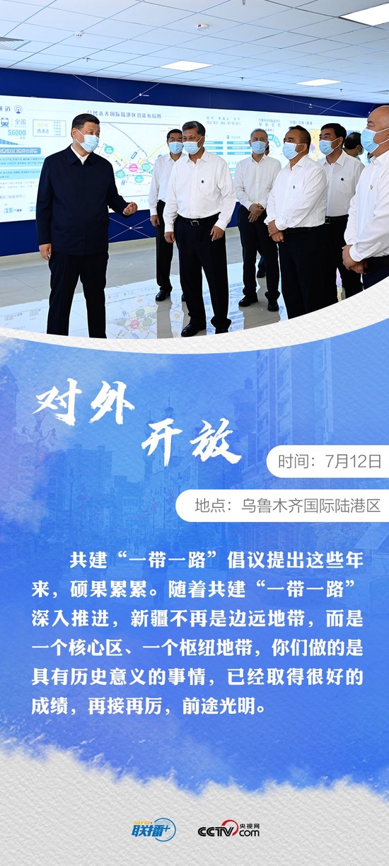 联播+ 7月12日至15日,习近平总书记时隔八年再次考察新疆。他先后来到乌鲁木齐、石河子、吐鲁番等地,深入学校、国际陆港区、社区、博物馆、农村和新疆生产建设兵团等进行调研。