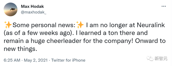 2021年5月,Neuralink联合创始人、自成立起一直担任公司负责人的Max Hodak在社交媒体上宣布,已经从Neuralink离职。
