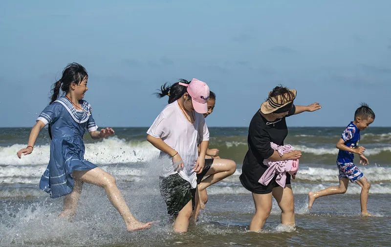 7月16日,海南琼海,游客在博鳌海滨冲浪戏水。当天是入伏第一天,我国多地进入“桑拿模式”,海南最高气温达到摄氏35度左右。视觉中国 图