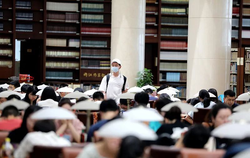 7月17日,杭州持续高温,杭州图书馆内座无虚席。酷暑天,不少市民选择来到图书馆,在凉爽的环境中提高学习效率,在书香里寻觅清凉,避暑学习两不误。视觉中国 图